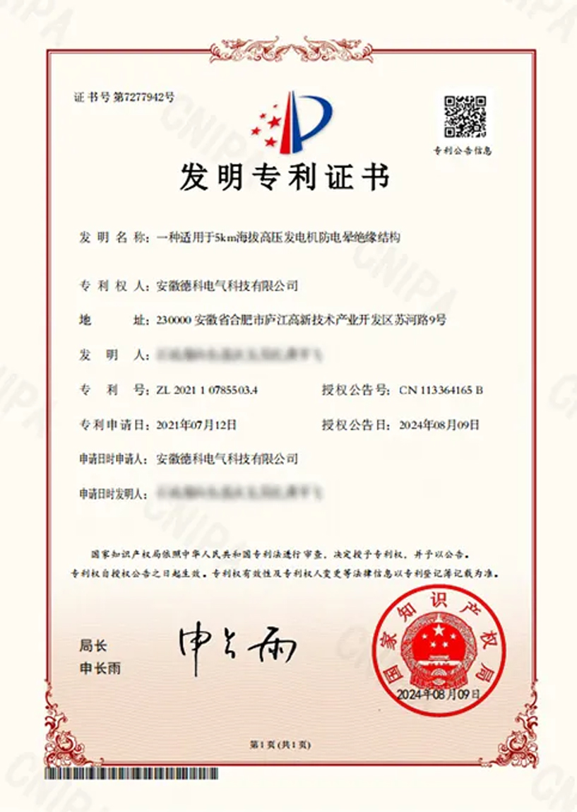 由milan米兰电子(中国)官方网站申请的《一种适用于5km海拔高压发电机防电晕绝缘结构》发明专利和《一种发电机减震底座》等五项实用新型专利,获得了国家知识产权局的批复,正式获得专利授权。milan米兰电子(中国)官方网站电气一直坚持自主研发和技术创新,所有产品皆拥有自主知识产权,截至目前共获得国家授权专利64项(其中:发明专利19项)。