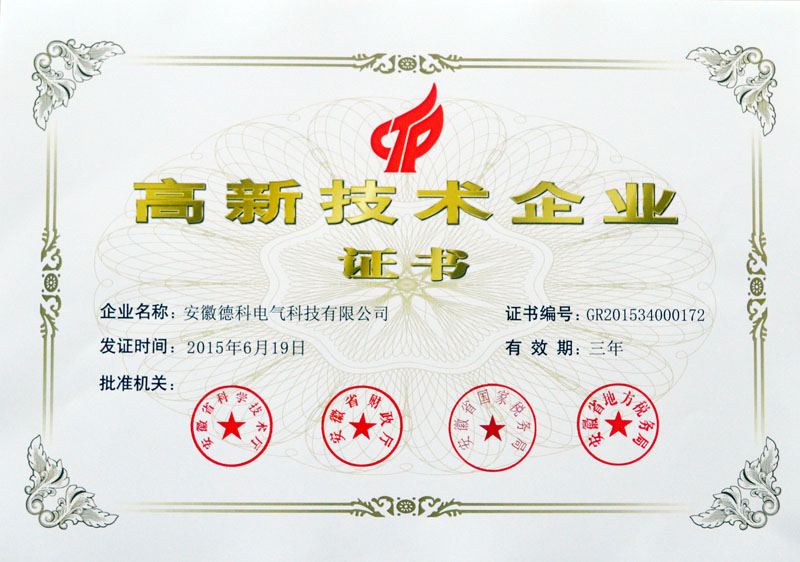 2015年11月,根据《高新技术企业认定管理办法》和《高新技术企业认定管理工作指引》的相关规定,我公司被认定为国家级高新技术企业,并于近日收到了由安徽省科学技术厅、安徽省财政厅、安徽省国家税务局、安徽省地方税务局联合颁发的国家高新技术企业认定证书,证书编号为GR201534000172。